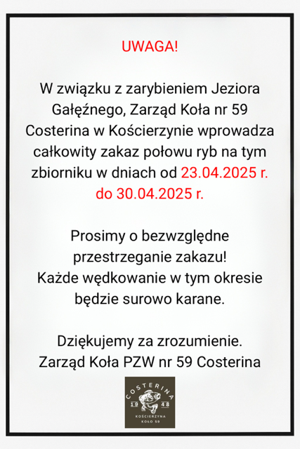 Aktualności Ważna informacja! Zarząd Koła 23 kwi 2025 • lektura na 1 min W związku z zarybieniem Jeziora Gałęźnego, Zarząd Koła nr 59 "Costerina" wprowadza...