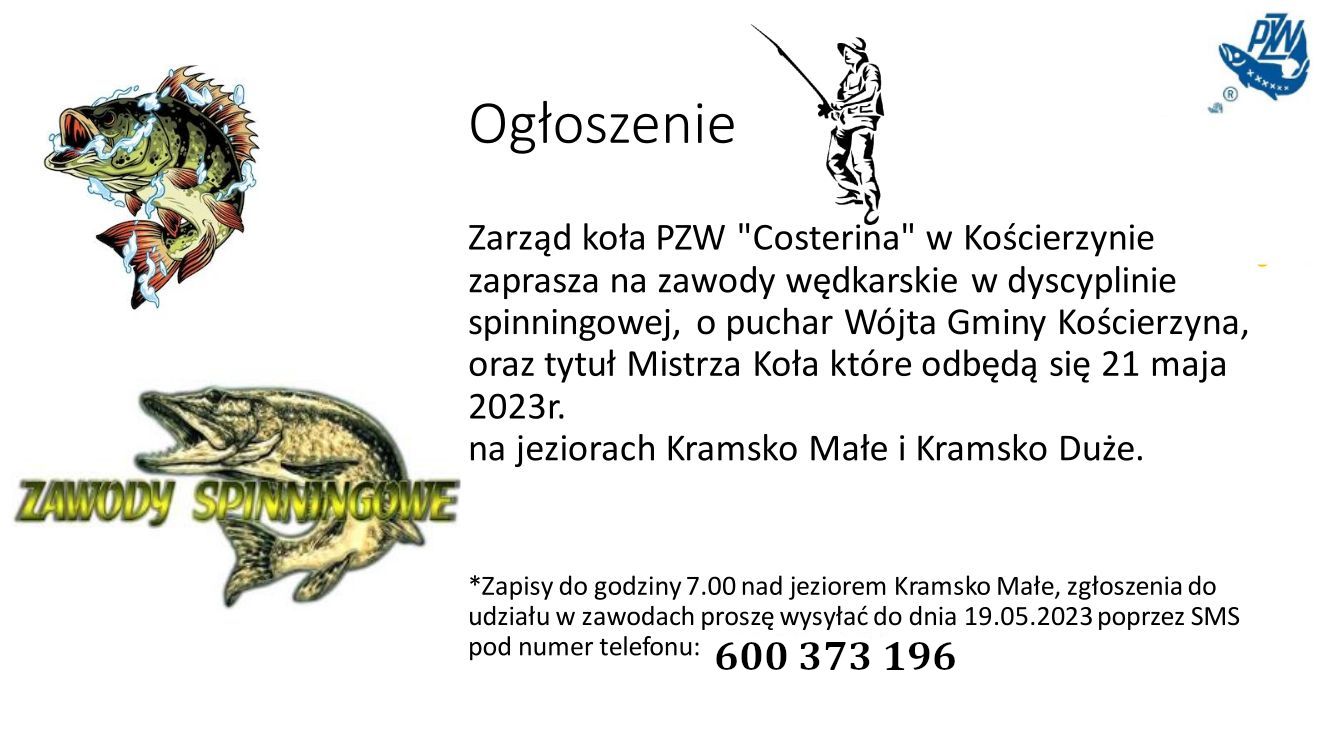 Aktualności Zawody spinningowe Zarząd Koła 11 maj 2023 • lektura na 1 min Zarząd koła PZW "Costerina" w Kościerzynie zaprasza na zawody wędkarskie...