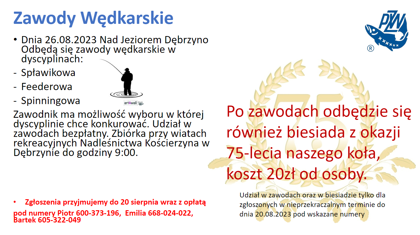 Aktualności Zawody wędkarskie Zarząd Koła 4 sie 2023 • lektura na 1 min Zapraszamy na zawody wędkarskie oraz biesiadę z okazji 75-lecia naszego koła...