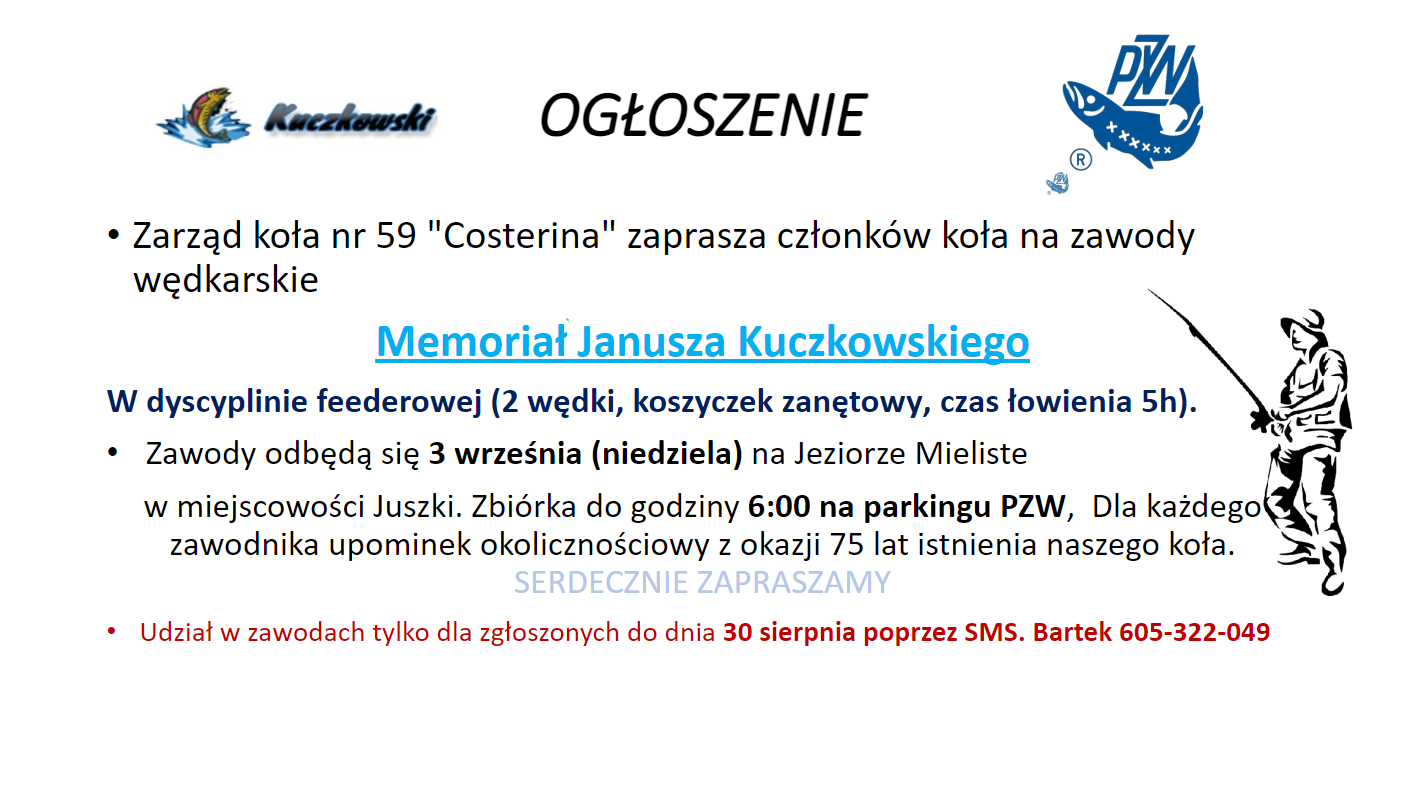Aktualności Zawody wędkarskie Zarząd Koła 18 sie 2023 • lektura na 1 min Zarząd Koła nr 59 "Costerina" zaprasza członków koła na zawody wędkarskieMemoriał Janusza Kuczkowskiego...